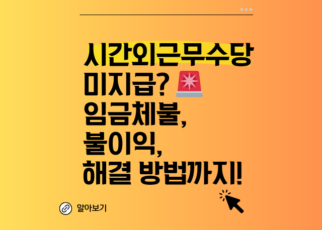 이 글에서는 시간외근무수당 미지급의 법적 문제점부터 사업주가 받게 될 불이익(처벌), 그리고 근로자가 자신의 권리를 찾아갈 수 있는 실질적인 해결 방법까지 상세히 알려드립니다. 더 이상 불합리한 상황에 침묵하지 마세요! 여러분의 정당한 권리를 지키고, 건강한 근로 환경을 만드는 데 이 글이 큰 도움이 될 것입니다. 💪
